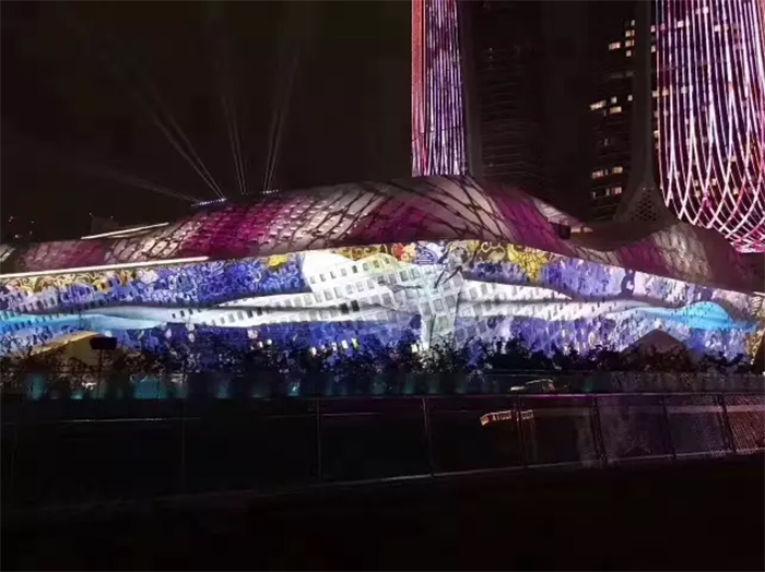 南京青奥会议中心是南京标志性建筑,由世界著名建筑师扎哈·哈迪德设计,包括两栋双塔楼和一栋会议中心。40台松下工程投影机PT-SRZ31KC以会议中心楼体为投幕,应用内置多画面拼接系统以及几何校正功能,在造型复杂的墙体上投射出流动、自然的精彩影像。31,000流明的高亮度使图像更加色彩鲜明,同时更具精准的层次渐变效果。会议中心流体造型上的绚丽图像,与双子塔上的灯光遥相辉映,在南京的夜空下闪耀无比,让每一位在场观众惊呼震撼神奇!