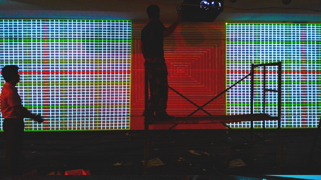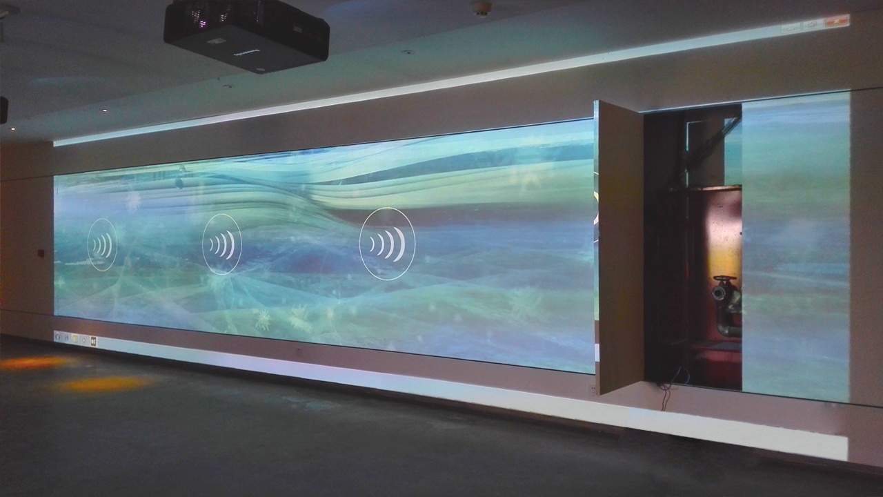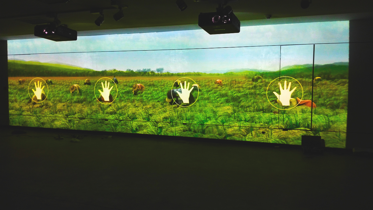 银川当代美术馆Kinect体感互动系统采用3台松下PT-FDX110融合为一个水平大桌面,四套Kinect体感互动设备采集动作数据,一台融合服务器运行“春、夏、秋、冬”四个场景。